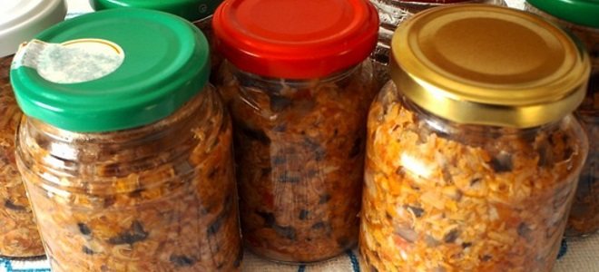 - Распределяется горячая грибная икра из лисичек на зиму в стерилизованные банки, укупоривается.