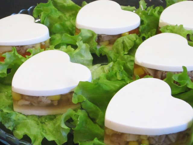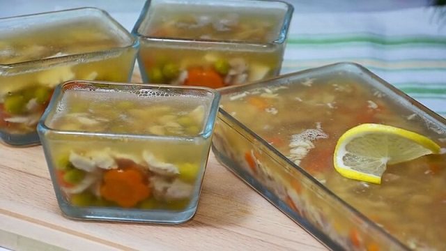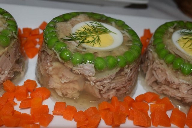 Наполнить формы до краев, можно украсить ломтиками чеснока или зеленым горошком и поставить на холод на двенадцать часов. Любите курицу? Посмотрите рецепт курица, запеченная в духовке.