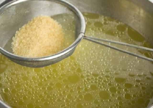 - Отдельно в пиалу налить один половник желатина, слегка охладить и растворить в нем желатиновый порошок. Затем перелить бульон обратно в чуть остывший бульон и тщательно перемешать.