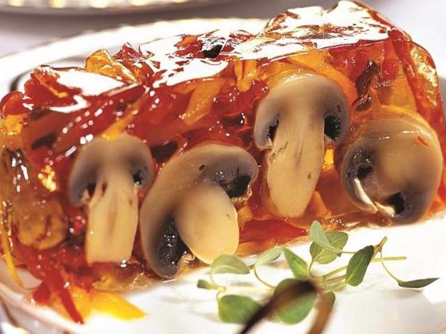 Можно добавлять в качестве ингредиента грибы. Очень красиво смотрятся на срезе целые грибы. Поэтому в таком заливном будут прекрасно смотреться небольшие белые грибы или шампиньоны.