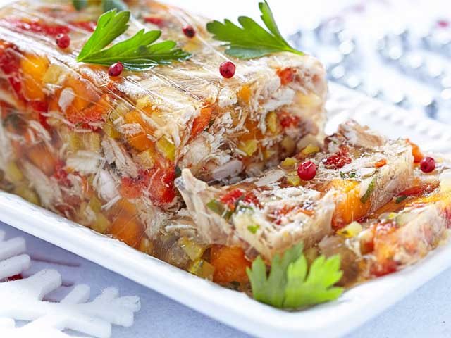 Если же не хотите выкладывать мясо красивыми слоями, ну к примеру, когда готовите его в будни, то просто разберите мясо на волокна, выложите в форму. Затем украсьте овощами, и залейте слоем желе нужного объема.