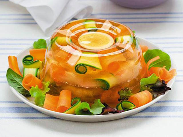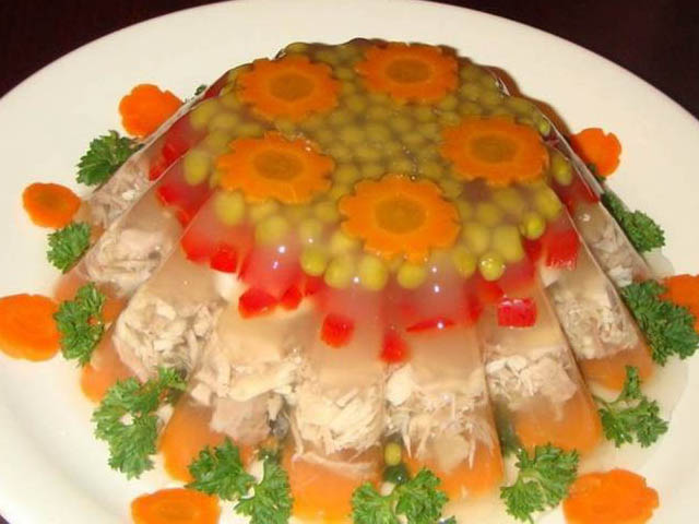 Как Вы наверное успели заметить, все рецепты даются практически по одной схеме. Готовится бульон, готовится желе. Затем форма наполняется ингредиентами и заливается бульоном с желатином. Затем ставится в холодильник и остужается.