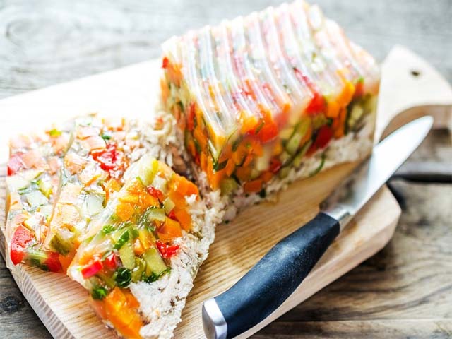 7. Сверху можно выложить следующим слоем куриное мясо, потом снова овощи, после чего залить содержимое куриным бульоном с желатином.