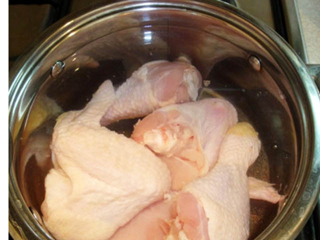 - Налить в глубокую кастрюлю воду, окунуть тушку птицы и отправить на огонь, доведя до кипения. Слить жидкость, снова залить чистой водой и поставить вариться повторно.