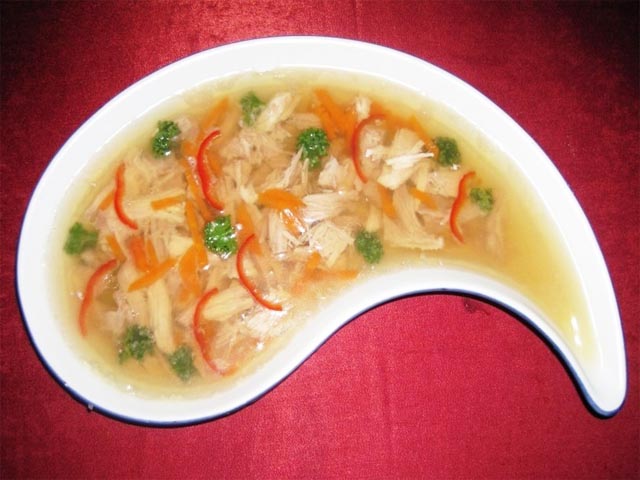 1. Отварить куриное филе без кожи по рецепту, данному выше. Затем филе достать, немного охладить и разобрать на волокна. А бульон процедить через несколько слоев марли.