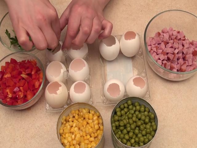 11. Выложить яйца на тарелку, по желанию украсить оставшимися овощами, зеленью, горошком и кукурузой.