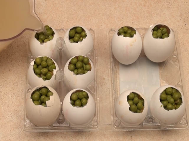 Вылить содержимое яиц, скорлупу промыть изнутри и снаружи содовым раствором, обдать кипятком и дать подсохнуть.