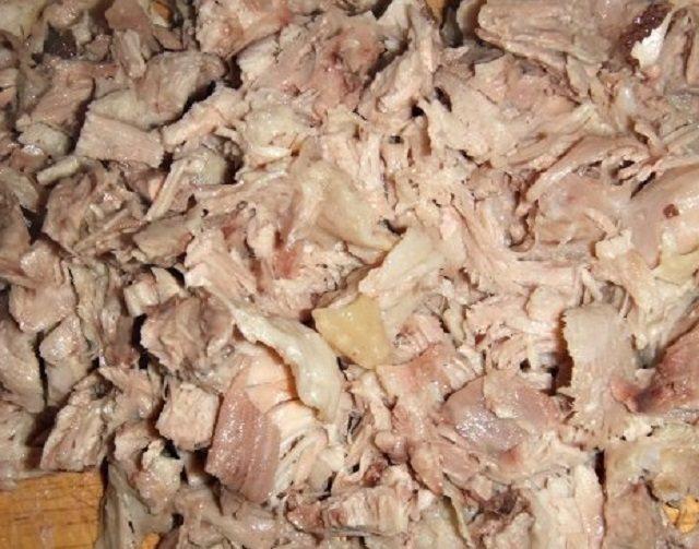 - Готовое мясо извлечь, охладить, освободить от костей и нарезать произвольными кусочками. Добавить молотый чеснок.