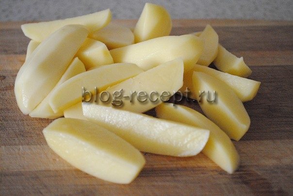 - Картофель моем, чистим и нарезаем дольками по длине.