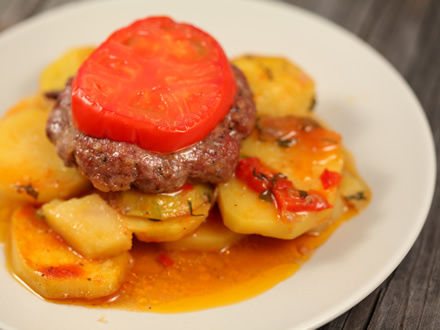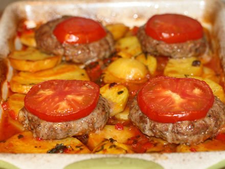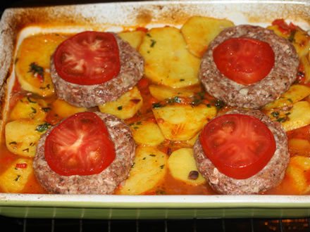 Спустя указанное время, разложите на картошку мясные котлеты, украсив каждую тонким ломтиком помидорки. И верните противень в горячую духовку еще на 20 минут.