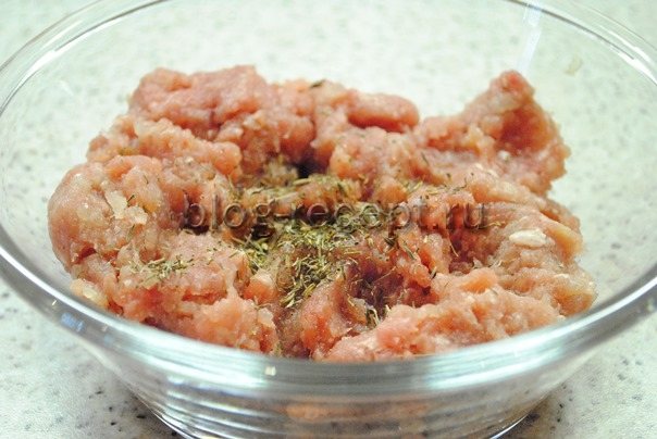 - В фарш добавляем специи. Это по желанию, я написала примерный их состав, можете изменить по своему вкусу. Если в нем нет лука – добавьте, как я писала выше. Солим.