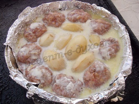 - Получившейся подливкой заливаем противень с котлетами и ставим в нагретую до 180°С печку на 1 час. В процессе готовки противень вынимаем и мясные шарики переворачиваем.