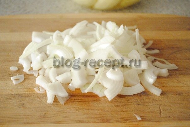- Тем временем готовим подливу. Для нее нарезаем луковицу полукольцами.