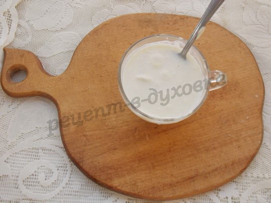 Ставим композицию в духовку, разогретую до 220С, и запекаем 15 минут. А пока картошка с котлетками запекаются, приготовим сметанную заливку, смешав сметану с водой и приправив по вкусу. Также можно добавить в соус ложку кетчупа или томатного сока.