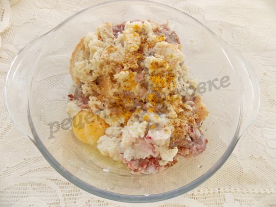 - Обычно для придания большей мягкости и сочности добавляют белый хлеб или батон, хотя мне еще нравится класть тертый на мелкой терке картофель. С хлеба срезаем корочку, крошим его в чашку и заливаем молоком. Кстати, идеально подходит черствый хлеб. Даем постоять 5 минут.