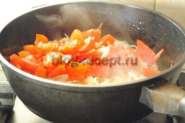 - Помидоры моем и нарезаем произвольными кусочками. Кладем в сковороду к луку.