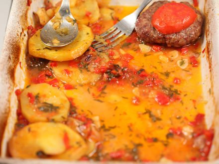 Доставайте картофель с котлетами из духовки и скорей раскладывайте блюдо по тарелкам, не забывая поливать каждую порцию скопившимся на противне соусом.