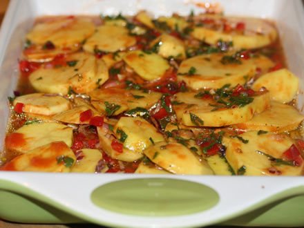 Картофель очистите, промойте и нарежьте тонкими кружочками.Болгарский перец очистите, промойте и нарежьте мелкими кубиками.Так же мелко порежьте петрушку и репчатый лук.Чеснок пропустите через пресс или натрите.Смешайте картошку с перцем, луком, чесноком и зеленью в тарелке, добавив масло, соль и специи.Разложите овощи на жаропрочный противень и залейте их томатным соусом, разведенным куриным бульоном или водой. Наливайте соус по краю, чтобы не смыть с картофеля специи и масло.Отправьте овощи в соусе запекаться в разогретую до 200 градусов духовку на 20 минут.