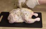 - Готовую птицу вынуть из духовки. В процессе приготовления получится много вкусного соуса, им надо полить курицу сверху. Можно сделать в районе грудки пару глубоких надреза и полить также соусом. Дать блюду немного постоять, пропитаться соусом и можно подавать к столу.