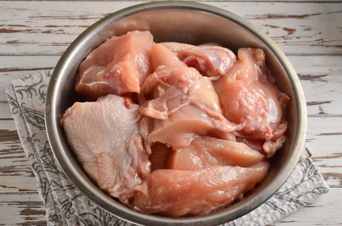 - Птицу лишить крупных костей, порубить на одинаковые куски.