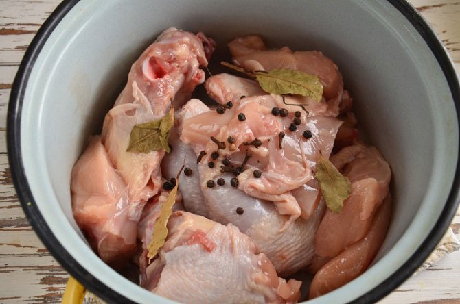 3. Хребет с шеей лучше разрубить на две части и затем все кусочки нужно уложить в большую кастрюлю. Туда же необходимо отравить подготовленные пряности – гвоздику, черный (и/или душистый) перец, лаврушку. Солить сразу не нужно.