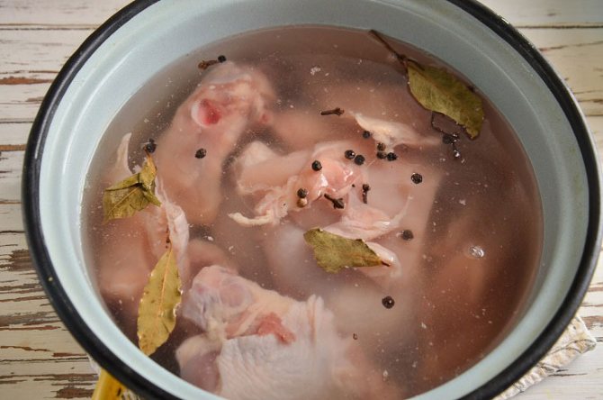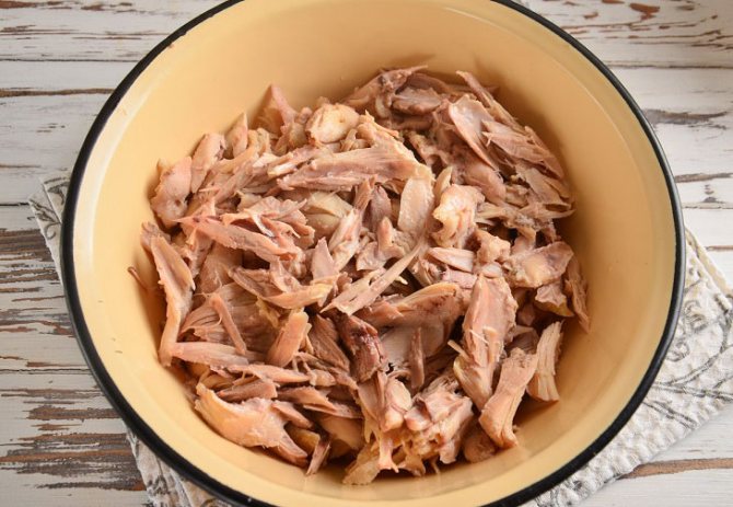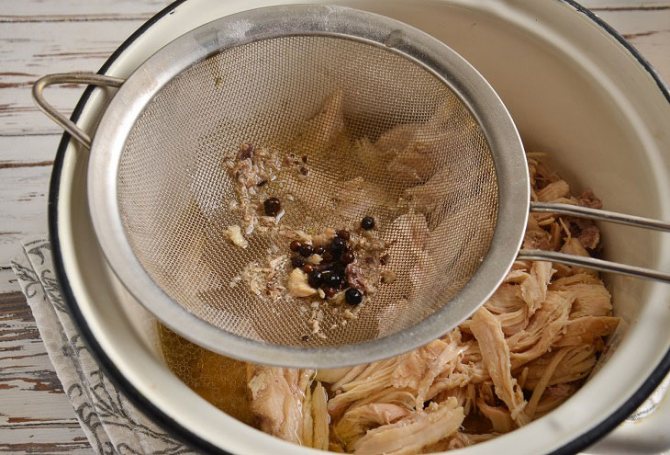 5. Спустя 3 часа кусочки курицы необходимо достать из горячего бульона – удобно делать это шумовкой. После того, как курица немного остынет, нужно разобрать ее на кусочки, отделив мясо от костей и убрав шкуру.