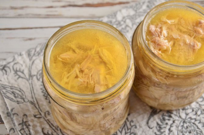 Для наваристого бульона, который зажелирует птицу, нужно оставить кости, но с ними предварительно придется поработать. Если вы планируете сохранить тушенку в идеальном состоянии на год и более долгий срок, обязательно разрежьте крупные трубчатые кости на несколько частей и промойте кусочки курицы после этого еще раз. Так вы выпустите воздух, мешающий хранению продукта. В остальном рецепт такой тушенки в домашних условиях от классического почти не отличается.