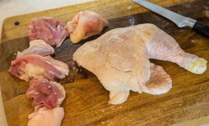 Курицу тщательно промываем под холодной водой, вытираем насухо с помощью бумажных полотенец и разрезаем на небольшие кусочки.