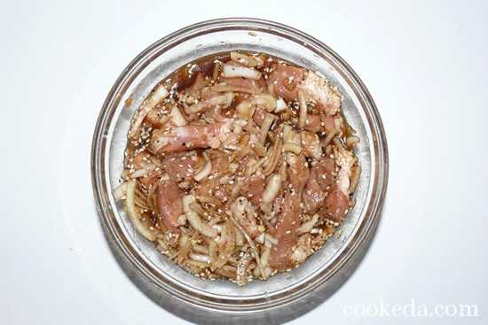 - В емкость с маринадом помещаем мясные ломтики и качественно вымешиваем. Главное: каждая полосочка должна быть «окутана» соусом. Пищевой пленкой накрываем миску и переставляем ее в холодильник на 20 мин.