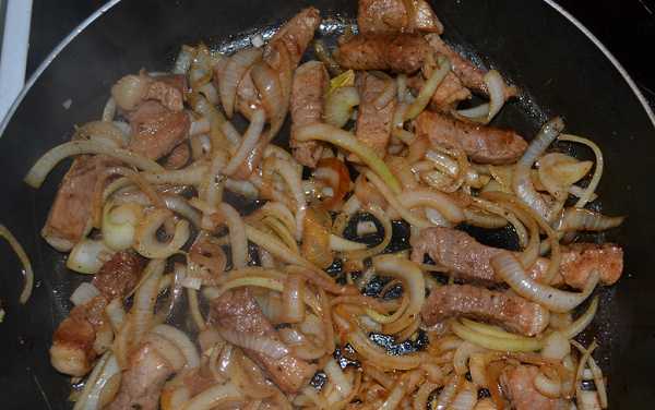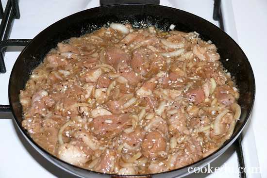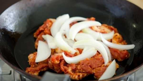 - Раскаленную сковороду смазываем жиром растительного происхождения и перекладываем в нее промаринованное мясо, а поверх укладываем лук.