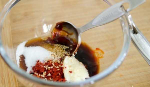 - Измельченный зубец дополняем 1/3 заготовленного соевого соуса и уксусом.