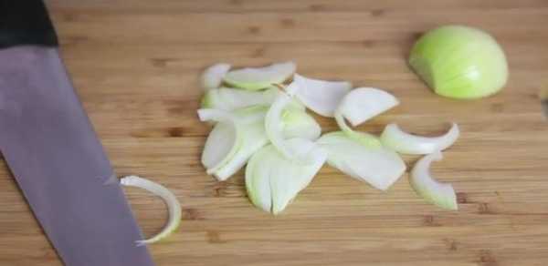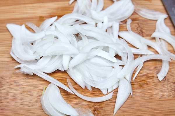 - Очищенные головки лука промываем и измельчаем в виде полуколец.