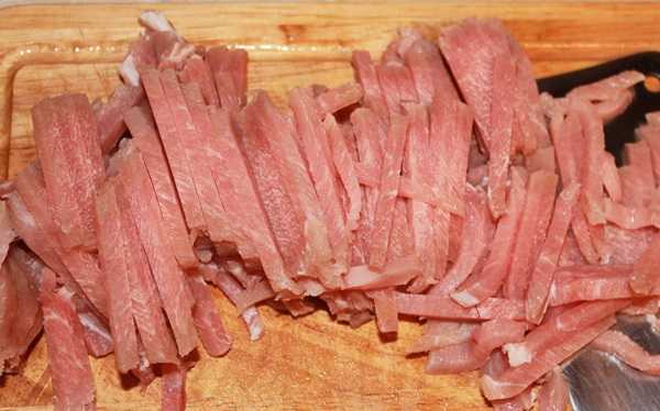 - Мясо обильно промываем и просушиваем. Подготовленную мякоть шинкуем тонкими полосками в 1 см толщиной и 5 см длиной (примерно).