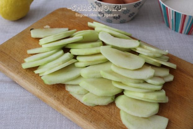 3. Далее, основываясь на рецепте, взять яблоки, очистить от кожуры, вырезать сердцевину. Порезать фрукты дольками. Для того чтобы яблоки не потемнели, необходимо обработать их лимонным соком.