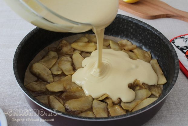 8. Полученное тесто вылить на яблоки равномерным слоем.