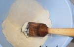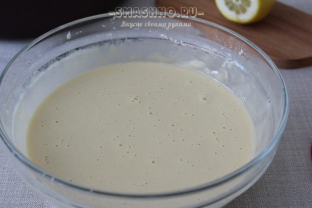 7. По рецепту добавить в емкость стакан муки. Опять взять миксер и все сбить. В результате тесто должно получиться не очень густым. Его консистенция будет напоминать кефир.