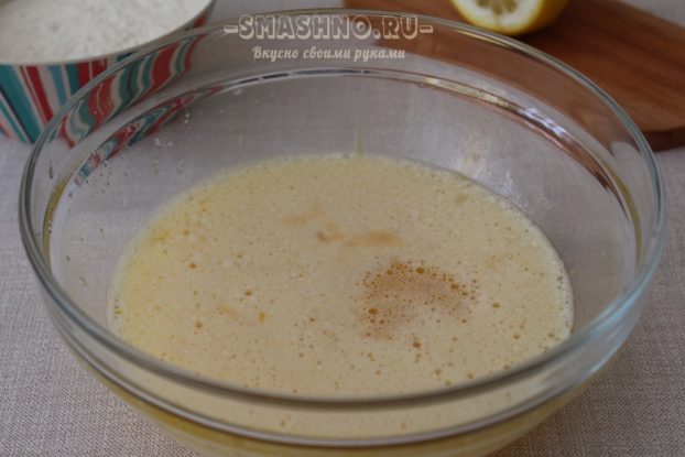 6. Чтобы приготовить тесто, необходимо в отдельную емкость отправить яйца, стакан сахара. Все взбить при помощи венчика или миксера. Основываясь на рецепте, масса должна быть белой и воздушной.