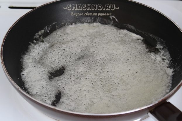 - Разогреть сковороду, растопить 250 г масла сливочного и медленно растопить в нем стакан сахара;