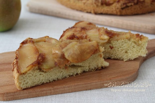 6. Перекладываем пирог с яблоками на доску, режем на порционные кусочки и подаём.