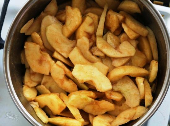 10. Кладем в кастрюлю порезанные яблоки и карамелизируем их 2-3 минуты. На этом этапе можно добавить по вкусу «Сахар с корицей» «HAAS», корректируем вкус. И для густоты начинки, смешиваем 1 ч. л. крахмала с 1-2 ст. л. сока. Тонкой струйкой вливаем крахмал в миску и быстро перемешиваем, 1 минуту провариваем и снимаем с плиты. Начинка должна быть «густая» без скопления жидкости, кусочки яблока цельные.