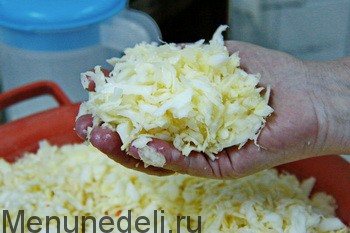 Капусту очищают от вялых и гнилых листьев, шинкуют тонкой соломкой.