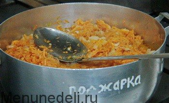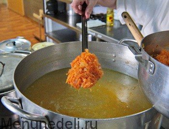 Лук и морковка нарезаются некрупно, обжариваются на сливочном масле. Именно они в саду добавляются в кастрюлю после картофеля, а не капуста, как это часто делают хозяйки дома. Лук должен провариться.