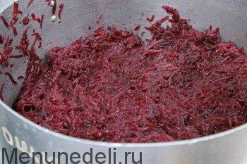 Вместе с бульоном начинают варить и свёклу. Доводят её до готовности, очищают, натирают на крупной терке и ставят пассероваться в растительном масле.