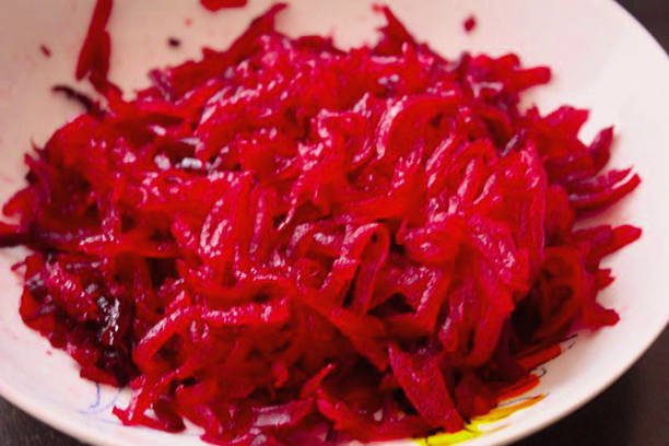 - Вареную свеклу натрите на крупной терке и сбрызните лимонным соком.