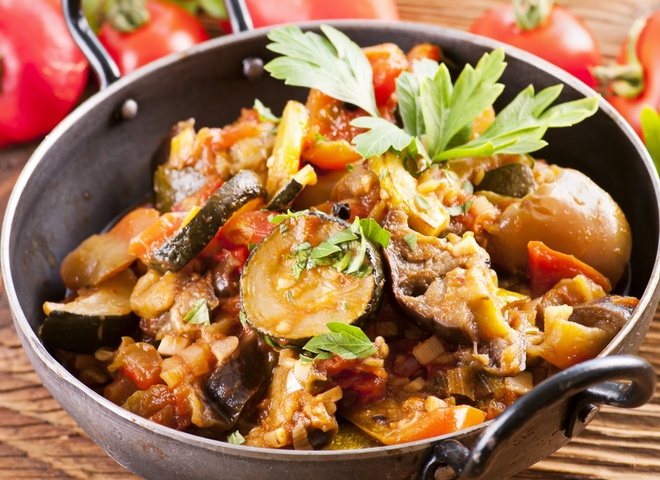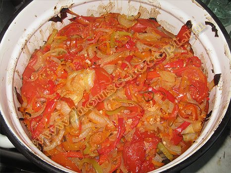 - Смешайте баклажаны, лук и перец с сахаром, солью и растительным маслом. Уложите в кастрюлю. Сверху положите томаты и поперчите.