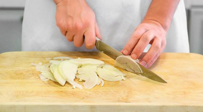 - Потом потребуется заняться луком. С него снимается шелуха. Готовые плоды следует измельчить на небольшие по размеру кубики.