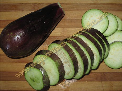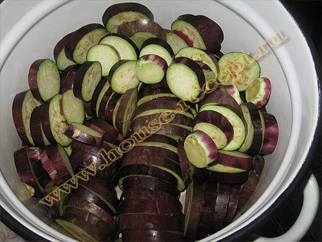 Для приготовления салата из баклажан нам, конечно, понадобятся баклажаны (синенькие) и конечно же десять штук. С них мы и начнем приготовление салата на зиму. Баклажаны моем и нарезаем кружочками толщиной 1- 1,5 см.