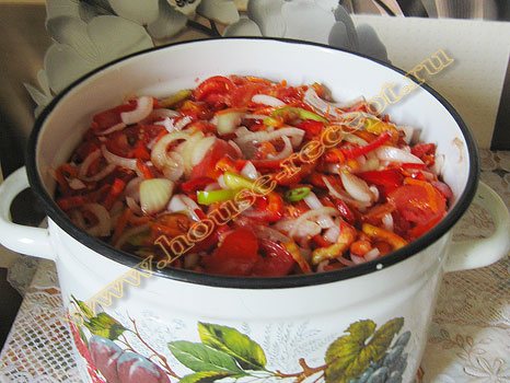 - Взять объемную кастрюлю. На дно выложить помидоры, далее – лук, баклажаны и перец. Слои повторять, пока не закончатся овощи.