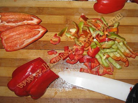 - Вымыть и вытереть перцы, срезать плодоножку с частью плода, удалить семенную коробку, разрезать на 4 части, а потом каждую нарезать вдоль на полосочки, выложить третьим слоем на лук.