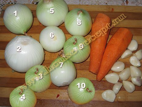 - Примерно одинаковые по размеру луковицы очистить, легче это сделать, если разрезать сначала их пополам, а потом удалить шелуху. Нарезать на средние кусочки или полукольца. Морковь крупно натереть.